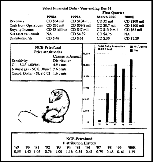 | NCE-Petrofund is a closed-end royalty trust that acquires and manages producing oil and gas properties in Western Canada and distributes the resulting cash flow to unit holders on a tax-deferred basis. NCE-Petrofund ("the Fund") is designed to provide investors with high levels of cash distributions through investments in the oil and gas industry. The Fund provides the benefits of owning producing oil and gas properties, without the exploration-related risks associated with investments in common shares of oil and gas companies. Unlike oil and gas companies, whose earnings are retained for reinvestment, NCE-Petrofund pays out all net cash proceeds from producing properties to the Fund' unit holders. All income flows to unit holders through monthly distributions. 2. Since 1989, the Fund has been acquiring and developing high quality, long life oil and gas properties and distributing the resulting cash flow through monthly income distributions to unit holders. At present the royalty trust has 55 million units outstanding. The current production/day equals at least 11,700 boe (barrels of oil equivalent). The established reserves equals 49 million boe. The reserve life is over 11 years. During 2000 the reserves increased by 355%. The oil and gas balance 58% oil - 42% gas. NCE-Petrofund is the 5th largest oil and gas royalty trust in Canada. NCE-Petrofund acquisition strategy: NCE-Petrofund looks to achieve a rate of return of 15%, acquisitions must be represented whereby 70% of the purchase price equals proven reserves. In addition, 50% of the properties must have a production life of greater than 20 years and all major purchases are subject to an independent engineering review. NCE-Petrofund's recent acquisitions of Crestar, July Lake, Weyburn & Kaybob cost $118 million (Canadian funds). The estimated reserves from the acquisition program equalled 24.6 mmboe (million barrels of oil equivalent). The cost or price/boe (barrels of equivalent) equals $4.79 (Canadian dollars). A very important factor needs to be magnified; that is, the oil and gas equivalent costs $4.79 CD, which in US funds equals around $3.40. The real picture, of course, is that in politically stable Canada NCE-Petrofund produces oil and gas in Canadian funds and sells the product for US Dollars. Recently oil has been priced at around $30/barrel. It is easy to see why the returns are mind-blowing! We get a stable country that borders the US, cheap, plentiful and high grade O & G equivalents, seasoned management, huge dividend payout (25%) and a juicy unit price of $5.30 CD or around $3.60 US, which should be priced at around double the current levels because the historical yield for trust of this nature within the US or otherwise should be yielding only 12%. This factor alone indicates the NCE-Petrofund could easily double from current levels. During 1998 Petrofund distributed to unit holders (remember that the dividends are tax deferred) a total of 48 cents CD. During 1999 distribution increased to 61 cents CD. During 2000, running through July 31, 2000, the distribution has reached 74 cents CD. If NCE-Petrofund only distributes .11/month during the remainder of 2000, then our total dividend would equal CD$1.29 or around $.90 US funds. According to management, distribution of .11 to .12 CD would be based upon US $28.50 WTI (West Texas Intermediate) oil price and $2.60 Canadian gas price.