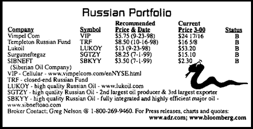 | Russian Briefs VIP - leading wireless teleco in Russia, operating under "Bee Line" family of brand names. As of the end of the March quarter, Vip has 573,700 subscribers. Revenues for the first quarter were approximately $65.8 million vs. $57.9 million - losses $2.8 million vs. $4.8 million. On July 28, VIP announced completion of $225.4 million securities offering - company sold 4.5 million ADS @ $21 5/8 and $173 million converted notes and 2.4 million ADS @ $21 5/8 to its strategic partner Telenor East Invest AS. Obviously, a very bullish development and shows confidence in the ever changing Russia. Lukoil - LUKOY - Russia's biggest oil producer reported pre-tax profits to domestic standards of 40.34 billion rubles, up from 2.03 billion in 98. For 2000 estimated significant growth in revenues and earnings - anticipate 20 - 25% growth rate. LUKOY currently trades at around 5x 00 earnings estimate. LUKOY intends on listing itself within the NYSE during August - September 00. The Russian Government intends to sell a 5% stake of its position. This would be a very bullish scenario for LUKOY, as well as the other major Russian oils, TNT, SGTZY and SBKYY. Surgutneftegaz - SGTZY - Revenue and earnings growth estimated @ 20 - 25% for 2000. Currently SGTZY trades @ 4 x 00 estimates. Currently SGTZY trades at around $15. Current quote, visit www.Bloomberg.com or ADR.com. We are very bullish towards SGTZY short and long term. Sibneft - SBKYY - Using U.S. generally accepted accounting principles, profits zoomed to $315.1 million in 99 from $36.1 million on 1998. The market valuation of Russian Oil companies/barrel of known resources is .35/barrel. Sibneft has pledged to double or triple investments and introduce new dividend policy. Sibneft shares suffer in price because of continued uncertainty that management is really being controlled by powerful tycoons and are using Sibneft funds for personal gains. Sibneft plans to more than triple upstream capital expenditures to $226 million and hike investment in refining and marketing. Sibneft reported revenues of $1.75 billion in 99 vs. $1.78 billion, with operating costs down 24% to $1.2 billion, from $1.57 in 98. Sibneft's strong financial performance results from rise in crude and refined product prices on global markets. 1999 crude output was 322,000 barrels. The 2000 target is 330,000. One ADR equals 10 local shares. Siftnet plans to issue level 3 ADR's and raise the company's free float by 10% to 15% from the current 12% of market cap. OVERVIEW Russia is risky, but the reward potential is mind-blowing. We are extremely bullish towards the major oils. We own all three in our personal account. Long term it is possible that LUKOY, SBKYY and SGTZY could trade 10x their current levels. Most of the Russian Oil in the ground costs around .35 - .40. Most international oil trades around 15x earnings - Russian oil trades in the low single digits. Have a shot of Vodka - it will become crystal clear!!! |