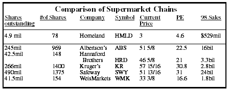It is hard to believe that HMDL currently trades at the current level of $3/share. The upside potential is very attractive. Based upon current fundamentals, HMDL today should be trading at $9 to $10, not $3. In our opinion, someone will target them as a delicious meal, i.e., ABS, SWY or KRT. When compared to its peers, obviously smallish in nature, but still highly undervalued when comparing PE multiples. The average PE for our group of stocks listed within the chart (comparison of supermarket chains) equals 24.4x 1998 numbers. If HMDL were to trade at this multiple, our share price would equal $15.86 - a far cry from current levels of $3.00. In reality, it does not matter that HMDL is a supermarket chain. Bottom line: a stock that trades at 50% of book, a PE of 4.6, trading less than 1x cash flow (EBITDA), 2x cash, PSR of .03, trading near its 52-low, insider buy and noted investor types holding huge position in the stock - has no business being at the current level of $3.00. This is the steal of 1999. Food for thought: Most internet stocks will never become a mature business as has HMDL, but yet are trading 10, 20 or 30x the current price of HMDL. It must be something in the water! George Solos is one of the shrewdest investors alive today. One of his funds owns 13% of the company. One has to wonder why!? Again, it is our opinion that most likely this situation will become a target by a much larger hungry supermarket chain looking to grow on the cheap! This situation is a great candidate for a value investor that does not value investments by eyeballs or clicks. Broker contact: Greg Nelson at 1-800-269-9460. |