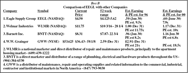 In our opinion, (Box A) the quickest as well as easiest way to analyze EEGL is to look at the PE estimates for fiscal 2000 without and 2000 with an acquisition. Revenue growth will balloon by 80% with an acquisition or 29% without. Earnings/share growth will surge by 50% over 1999E with an acquisition of 20% without. Before we assign a PE valuation for EEGL, we should first review the nine month numbers, that is, EEGL has already earned .36/share from generated revenues of 114 million, with managements guidance fiscal 99, which has already ended, should look like 155 million in sales and .50/share based upon fully diluted shares outstanding of 8.4 million. We believe that without comparing EEGL to any peer companies that are in similar business models and formulating a conservative PE valuation that fairly represents EEGL without hyping or misleading potential investors, that a PE valuation of 18 fairly represents what EEGL should trade at. Using this number and applying our earnings/share estimates, EEGL could trade at $9, $10.8 and $13.50, respectively, when we look at fiscal 1999, 2000 and 2000+. A far cry from EEGLs current $4.50 share price. |